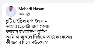 শনিবার (৭ ফেব্রুয়ারি) নিজের ফেসবুক অ্যাকাউন্টে দেওয়া এক স্ট্যাটাসে মেহেদি হাসান লেখেন, ‘ছুটি চাইছিলাম, পাইলাম না; আমার ছেলেটা মারা গেল!!!’